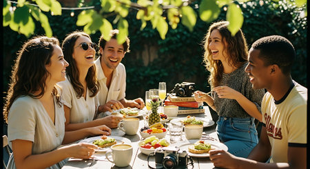 A cheerful group of friends sharing a meal outdoors, surrounded by greenery and natural light, with various dishes and drinks on the table.