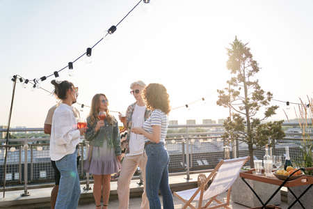 Group of young cheerful and affectionate friends enjoying outdoor party in rooftop cafe while having beer and cocktails and chatting