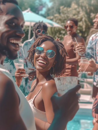 Generative AI : Happy multiracial friends having fun on a pool party on vacation Luxury vacation concept with young people in summer at hotel resort Pov view