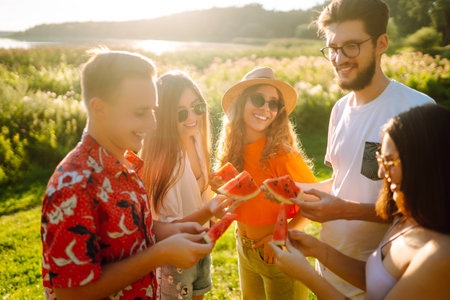 Group of young friends having picnic, eating watermelon, enjoy summer party. summer vacation concept