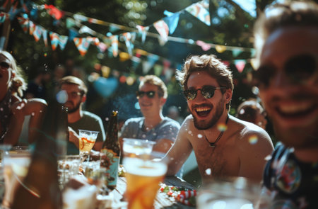 A vibrant summer gathering featuring friends enjoying food and drinks in a lush backyard. The scene captures joy, laughter, and connection in a lively outdoor setting.