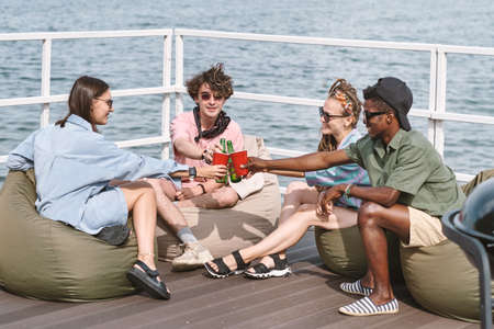 Smiling friends resting in bean bags on pier and toasting with plastics cups and beer bottles