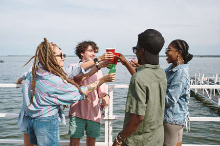 Happy joyful young people toasting with glasses and beer bottles when having small party on pier