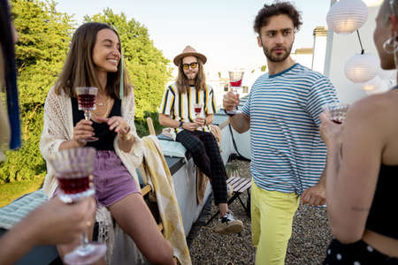 Young stylish friends having fun, hanging out and drinking wine at party on the rooftop terrace