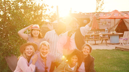 Portrait Of Mature Friends Sitting At Outdoor Campsite Bar Against Flaring Sun