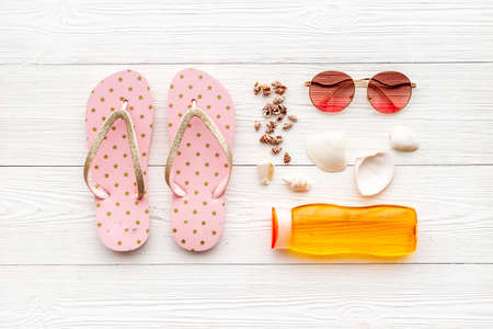 Summer vacation concept on white wooden background - top view