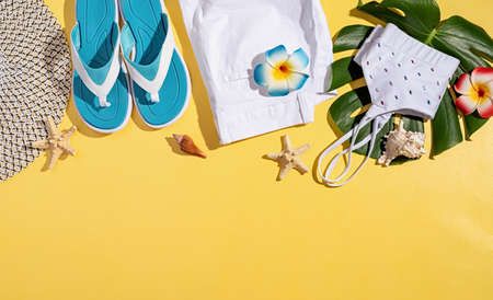Summer and vacation concept. summer accessories with clothes, shoes, tropical leaves and flowers, flat lay on yellow background