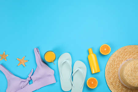 Flat lay composition with beach objects on light blue background, space for text