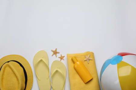Composition with beach accessories on white background