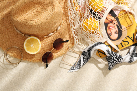 String bag with fashion magazine, fresh lemons and accessories on beige textured background, flat lay