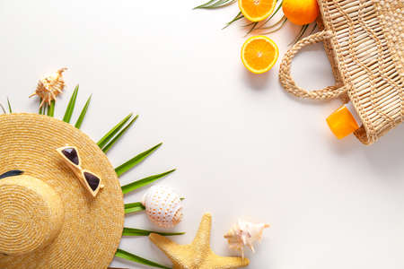 Summer travel vacation background with sun hat, camera, sea shells, tropical palm leaf on white background. Flat lay composition with beach accessories. Top view with copy space.