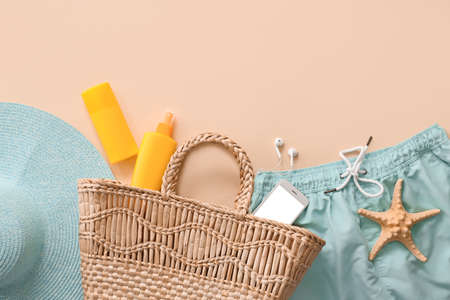 Beach bag with sunscreen cream and accessories on color background
