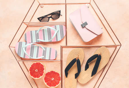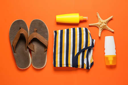 Female beach clothes and accessories on color background