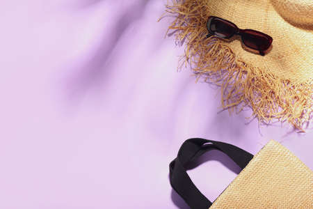 Creative vacation on sea background. Travel beach accessories on purple background with a shadow from tropical palm leaf. Top view