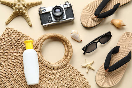 Sunscreen cream with photo camera and beach accessories on beige background