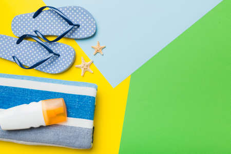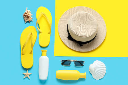Beach accessories. Various creams, glasses, hat and towel with sea shells on a colored background. Top view. Flat Lay.