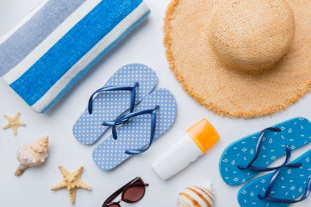 Summer vacation concept flat lay. beach accessories and towel top view. Space for text. travel concept.