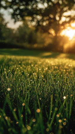 Close-up view of vibrant green grass covered in glistening dewdrops. The early morning sun casts a warm golden glow, creating a serene and refreshing natural landscape perfect for relaxation and tranquility.