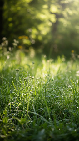 A close-up shot captures lush green grass in soft focus, speckled with water droplets. The scene is illuminated by warm sunlight, creating a bokeh effect in the background. The natural composition suggests a serene outdoor setting, ideal for projects seeking to evoke tranquility and freshness. It could be used for various commercial and editorial applications.