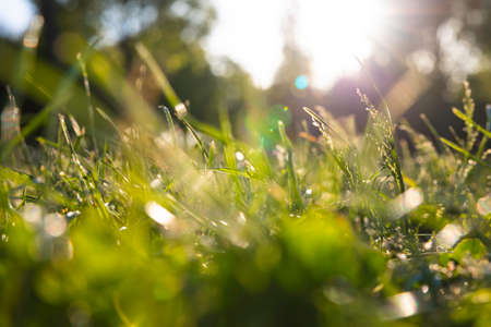 Green grass with dewdrops in the early morning sun