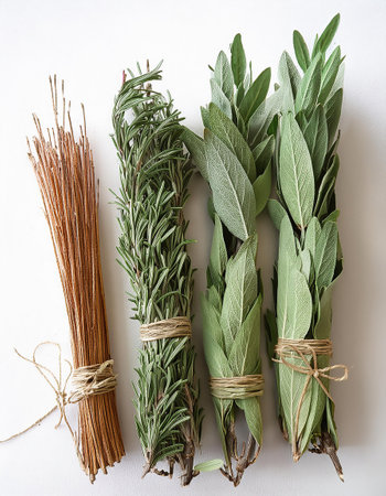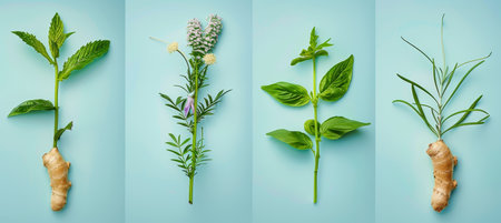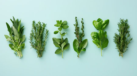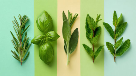 Bright greens of rosemary basil sage and mint create an artistic herb display on pastel backgrounds.