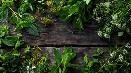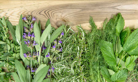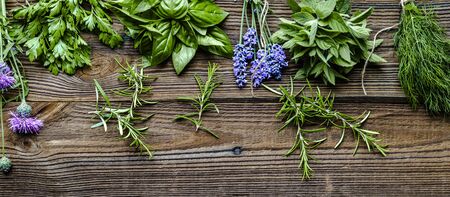 Fresh garden herbs on wooden table. Top view with copy space. Selective focus on the wooden table.