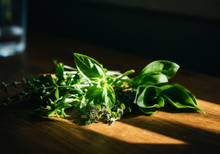 Fresh basil and thyme herbs on wooden table in sunlight.