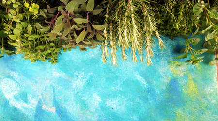 Bunches of fresh raw herbs - mint, thyme, dill, parsley, basil and tarragon on a textured background. Top view. kitchen banner