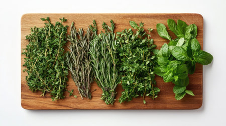 A variety of fresh herbs like thyme, rosemary, and mint on a wooden cutting board, top view