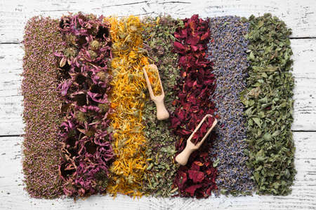 Rows of dry medicinal herbs - heather, echinacea, calendula, wild marjoram, rose petals, lavender flowers and lemon balm on white board. Two wooden scoop of healing plants and berries, top view.