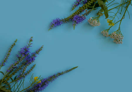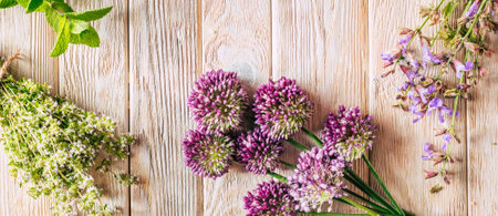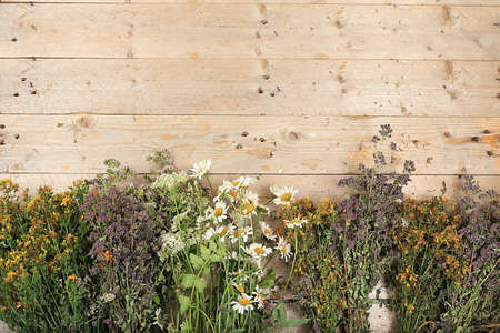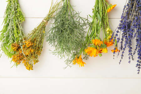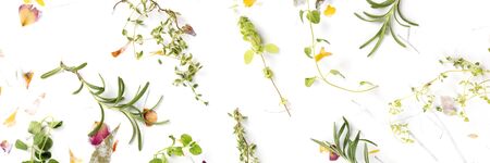 Harvesting herbs, long banner. Healing plants on a white wooden background. High quality photo