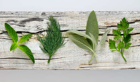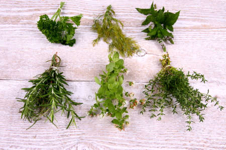 Mix of fresh herbs from garden on an old table top view. Parsley, basil, rosemary, thyme, mint, marjoram. Green herbs background