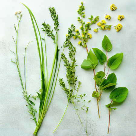 A variety of fresh herbs and greens are arranged on a light surface showcasing their vibrant colors and textures.