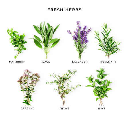 Rosemary, mint, lavender, sage, marjoram and thyme collection. Creative layout with fresh herbs bunch on white background. Top view, flat lay. Floral design. Food and alternative medicine concept