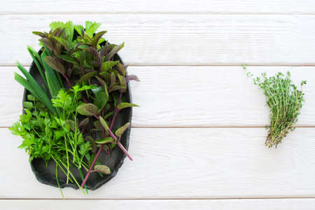 Fresh herbs on plate and thyme flat lay copyspace. Basil, parsley and chives on black plate at one side and bunch of thyme at other side of picture. Flavoring on white wooden background. void