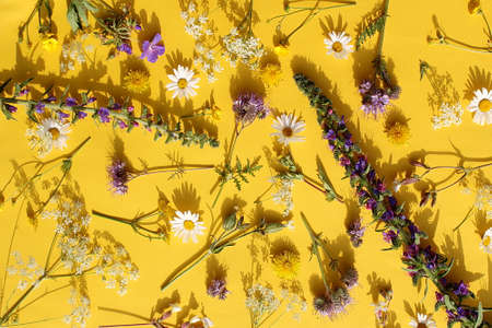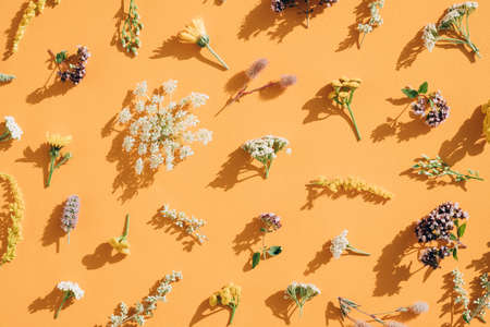 Modern flower composition. Trendy floral pattern made of wild field flowers with shadows over orange background. Summer background, flat lay style