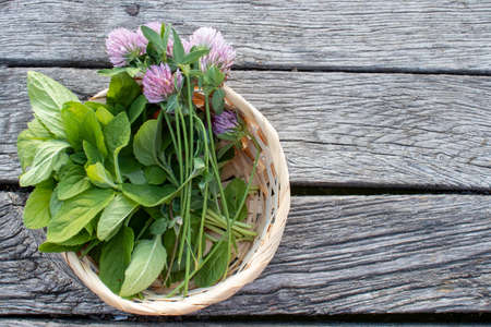 Fresh mint leaves and red clover flowers in a basket on a wooden table. Bunch of fresh herbs on old gray board background with copy space.