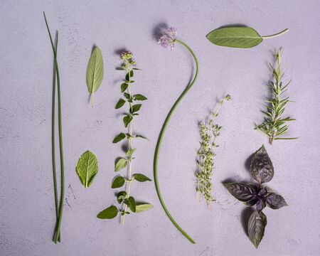 Food background on a concrete surface, spicy garden medicinal herbs: mint, sage, oregano, rosemary, lavender. Copy space. Ingredients for making herbal tea or cooking seasoning