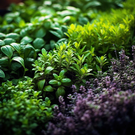 A vibrant collection of fresh herbs arranged on a dark background, showcasing their rich colors and textures. Ideal for culinary presentations and food photography.