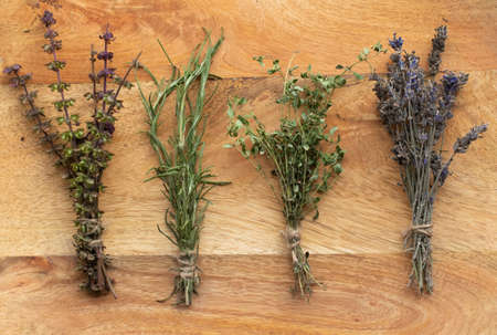 Bunches of dried lavender, thyme, rosemary and basil on a wooden background. Aromatherapy and Traditional Medicine Concept.