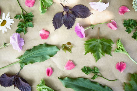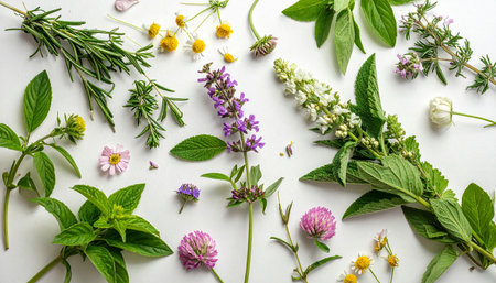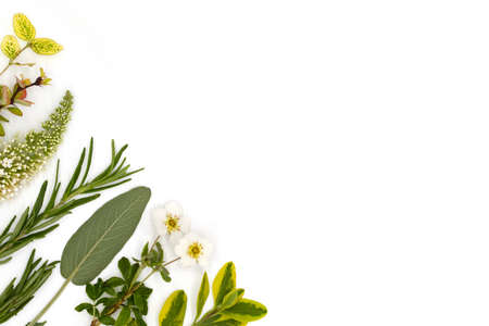Flat lay, flowers, bright greens and medicinal herbs on white background with copy space, top view