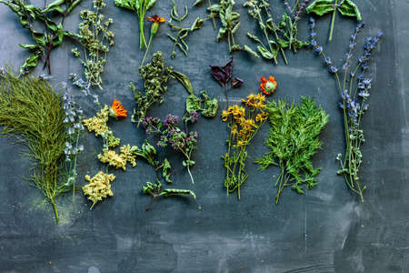 Collection of medicinal plants, herbs and flowers. Botanical assortment for homeopathy. Concept of natural remedies, alternative medicine, phytotherapy, green pharmacy, herbal healthcare. Copy space