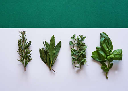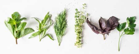 Flat-lay of various fresh green kitchen herbs. Parsley, mint, savory, basil, rosemary, thyme on white background, top view. Spring or summer healthy vegan cooking concept