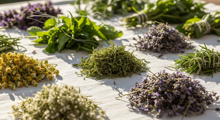 Various fresh and dried herbs are laid out in piles on a white cloth in the sunlight. The assortment includes chamomile, fresh mint, dried rosemary, and bundles of lavender, ready for use in cooking or aromatherapy.