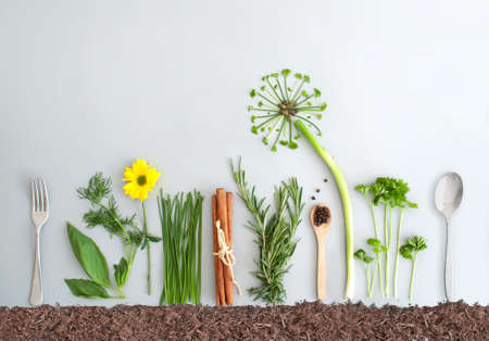 Seasonal summer herb salad ingredients and dandelion flower made from chives, parsley and spring onions