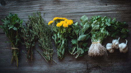Various Wild Herbs Gathering Medicinal Alternative Treatment Wooden Background Rustic Country