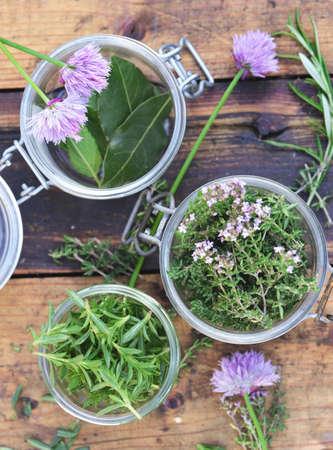 aromatic herbs in glass jar leaf and flowers of chive on a table