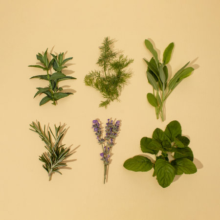Fresh rosemary, lavender flowers, mint mojito, dill, sage and peppermint on a beige background. Natural medical concept