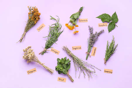 Set of medicinal plants and wild herbs, concept of alternative medicine and natural cosmetics, background, mint, chamomile, oregano and yarrow are used to treat diseases flat lay