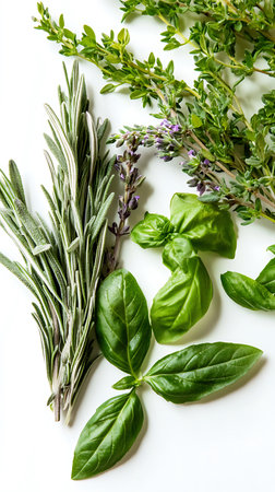 Close-up, top-down shot showcases fresh rosemary, thyme with purple flowers, and vibrant green basil leaves neatly arranged on a clean white background. Natural light highlights the textures.
